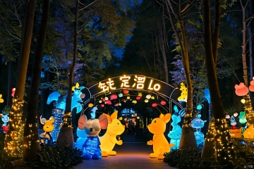The image presents an outdoor nighttime scene centered around a decorative entrance that reads "铁定溜溜" in neon green letters. The entrance is adorned with various light sources, including blue and yellow lights forming the shapes of cartoon characters. These characters are whimsical and appear to be part of a theme park or similar entertainment venue. The characters include a mouse-like figure and a dog-like figure among others. The backdrop is a natural one, with trees and foliage, suggesting that this entrance is located in a park-like setting. The overall impression is one of festivity and entertainment.