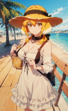 <lora:Roxane-000010:0.8>,Roxane CYQL,1girl,solo,looking at viewer,dog girl,blonde hair,orange hair,short hair,hairband,black hairband,hair between eyes,dog ears,animal ears,floppy ears,brown eyes,collar,black collar,large breasts,tail,dog tail,((Ruffled_off-the-shoulder_dress:1.5),(Straw_hat:1.4),(Basket_woven_bag:1.3),(Beachside_boardwalk_background:1.4):1.3),(yandere:1.2),(portrait:1.1),from_below,Instrument display, Soundproofing panels, Record player, Vinyl collection, Concert posters,beautiful detailed sky,beautiful detailed glow,posing in front of a colorful and dynamic background,masterpiece,best quality,beautiful and aesthetic,contrapposto,female focus,wallpaper,