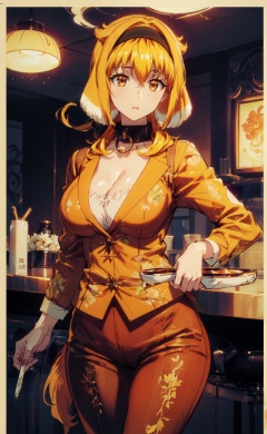 <lora:Roxane-000010:0.8>,Roxane CYQL,1girl,solo,looking at viewer,dog girl,blonde hair,orange hair,short hair,hairband,black hairband,hair between eyes,dog ears,animal ears,floppy ears,brown eyes,collar,black collar,large breasts,tail,dog tail,(seductive_smile:1.2),beautiful face,beautiful eyes,glossy skin,shiny skin,((Chic_tweed_blazer:1.5),(Cigarette_trousers:1.4),(Pointed-toe_pumps:1.3),(Modern_diner_background:1.4):1.3),(portrait,from_below,on back:1.2),holding flower,Mountain waterfall, Picnic, Noontime sun, Cascading water, Fresh air, Relaxation,lily,beautiful detailed sky,beautiful detailed glow,(English text:1.3),(border:1.5),posing in front of a colorful and dynamic background,(masterpiece, best quality, beautiful and aesthetic:1.3),contrapposto,female focus,fine fabric emphasis,wallpaper,fashion,Lipstick,depth of field,intricate_detail,finely_detailed,fine_fabric_emphasis,(glossy),<lora:增强减少细节add_detail:0.4>,