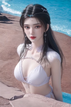 1girl, (full body:1),arm support, beach, bikini, bikini bottom, black hair, blurry, blurry background, breasts, brown eyes, cleavage, collarbone, day, depth of field, front-tie top, horizon, jewelry, lips, long hair, looking at viewer, lying, medium breasts, navel, necklace, o-ring, ocean, outdoors, parted lips, pool, red lips, sand, shore, sitting, solo, swimsuit, water, waves, white bikini <lora:dingdang-limuwanxfxv2:0.8>