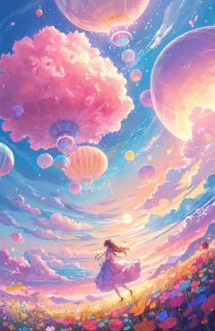 Illustration, styled by makoto shinkai, dream world, a fantastical dream world, dreamy colors, dreamcore, pastel colorpalette, - drawn animation cells, fantastical, rich and detailed, vibrant, soft and defined lines, balanced yet dynamic, soft natural lighting, colorful, vibrant colors, sky islands, dreamy colors