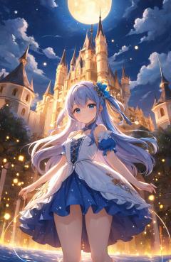 "Majestic fantasy anime art style, depicting a grand floating castle suspended above a shimmering sea of clouds. A young girl in an ornate dress, with glowing magical symbols woven into the fabric, stands at the edge of the castle’s terrace. The moonlight casts a soft glow on her and the surrounding castle towers, while the night sky is filled with countless stars, creating a dreamlike scene."