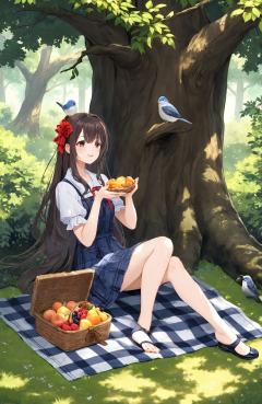 "Forest Picnic, a girl sitting on a checkered blanket under a big tree, enjoying a basket of fruits and pastries, with birds chirping around."
