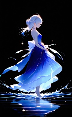 masterpiece,best quality,high quality,(colorful),nai3 Style,loli,w1girl,dress,solo,blue theme,closed eyes,blue dress,black background,standing on liquid,water,ripples,from side,jewelry,full body,strapless dress,profile,standing,bare shoulders,strapless,gradient dress,high heels,sparkle,tiptoes,earrings,walking on liquid,white hair,updo,glowing,barefoot,reflective water,splashing,simple background,breasts,reflection,necklace,light particles,long dress,floating clothes,back bow,closed mouth,hair ornament,water drop,blue hair,tiara,ribbon,hair bun,gown,choker,braid,bare arms,beads,bow,ahoge,layered dress,long hair,reflective floor,transparent,