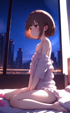 masterpiece,best quality,high quality,(colorful),nai3 Style,loli,1girl,solo,sitting,short hair,cityscape,barefoot,night,city,building,brown eyes,city lights,pillow,bed,indoors,brown hair,off shoulder,shirt,sky,on bed,scenery,skyscraper,wariza,window,hand between legs,between legs,bare shoulders,from side,depth of field,blurry,bare legs,blush,bed sheet,condom,