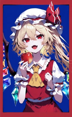 masterpiece,best quality,high quality,(colorful),loli,1girl, apple, flandre scarlet, food, fruit, solo, blonde hair, hat, red eyes, mob cap, fang, skin fang, open mouth, holding fruit, holding, holding food, one side up, white headwear, yellow ascot, red apple, upper body, ascot, crystal, wrist cuffs, red vest, wings, border, short sleeves, looking at viewer, hat ribbon, vest, red border, white shirt, red ribbon, blue background, ribbon, shirt, puffy short sleeves, puffy sleeves, simple background, frills, hair between eyes, ribbon-trimmed headwear, long hair