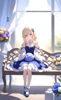 masterpiece,best quality,high quality,(colorful),nai3 Style,loli,transparent,1girl,butterfly hair ornament,bouquet,dress,holding bouquet,flower,blue butterfly,butterfly,hair ornament,blonde hair,solo,blue footwear,white socks,blue dress,bug,holding,smile,long hair,blue eyes,socks,white flower,looking at viewer,closed mouth,detached sleeves,jewelry,sitting,blush,twintails,blue flower,necklace,bench,full body,window,frilled dress,white sleeves,braid,rose,white rose,on bench,sleeveless dress,very long hair,sleeveless,yellow flower,indoors,picture frame,purple flower,vase,low twintails,hair flower,day,bare shoulders,shoes,frills,blue rose,dress flower,potted plant,curtains,yellow rose,sitting on bench,breasts,blue gemstone,bow,white collar,twin braids,wide sleeves,plant,