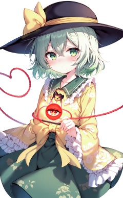 masterpiece,best quality,high quality,(colorful),loli,1girl,komeiji koishi,solo,hat,green eyes,skirt,third eye,shirt,green skirt,black headwear,yellow shirt,floral print,long sleeves,frills,wide sleeves,looking at viewer,ribbon,heart of string,heart,frilled sleeves,white background,rose print,yellow ribbon,bow,hat ribbon,hat bow,closed mouth,yellow bow,frilled shirt collar,short hair,green hair,simple background,medium hair,eyeball,blush,hair between eyes,