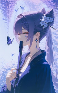 masterpiece,best quality,high quality,(colorful),loli,1girl,butterfly,keqing \(genshin impact\),hair ornament,hand fan,bug,flower,jewelry,solo,earrings,hair bun,cone hair bun,purple hair,folding fan,holding fan,blue butterfly,butterfly tattoo,looking at viewer,holding,tattoo,hair flower,long hair,purple eyes,sideways glance,nail polish,blue flower,folded fan,upper body,braid,chinese clothes,facial tattoo,twintails,covering own mouth,double bun,hanfu,alternate costume,profile,purple nails,facial mark,sidelocks,drop earrings,long sleeves,hairpin,from side,