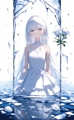 masterpiece,best quality,high quality,(colorful),nai3 Style,loli,1girl,solo,long hair,dress,looking at viewer,white eyes,glass,grey eyes,white dress,white hair,flower,broken glass,white theme,bare shoulders,blue theme,dress flower,glass shards,white flower,water,parted lips,closed mouth,sleeveless,reflection,sleeveless dress,watermark,white rose,expressionless,