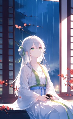 masterpiece,best quality,high quality,(colorful),[Artist toosaka asagi],[[[Artist wlop]]],[Artist chen bin],[Artist omone hokoma agm],Artist hiten (hitenkei),loli,Artist:CyanAutumn,hanfu,1girl,solo,green eyes,chinese clothes,rain,flower,window,night,wide sleeves,ribbon,long sleeves,grey hair,long hair,hair ribbon,indoors,branch,collarbone,looking up,holding,sitting,closed mouth,