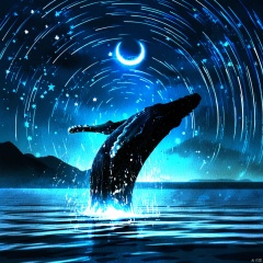 s-style, silhouette painting, outdoors, sky, water, no humans, majestic, night, animal, moon, star \(sky\), night sky, scenery, starry sky, reflection, blue theme, crescent moon, a black silhouette of majestic whale, a breathtaking of nighttime scene over a body of water, a silhouette of majestic whale seemingly leaping out of the water, the ilhouette of whale is illuminated with a radiant blue glow, above the ilhouette of the ilhouette of whale the sky awash with a myriad of stars forming intricate patterns and trails. a crescent moon hangs in the sky, the water below reflects the stars and the moon, a mirror-like effect, nighttime scene, stars, ethereal ambiance