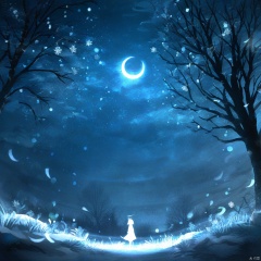 s-style, silhouette painting, ethereal ambiance, 1girl, solo, glowing, scenery, blue theme, silhouette, snowflakes, a white silhouette of a girl, night, moon, reflection, crescent moon, reflective ground, bare tree, a serene nighttime landscape, a large and leafless tree with intricate branches and snowflakes are scattered throughout the sky, a child figure stands near the tree's base which is gazing up at the celestial wonders. the overall color palette is dominated by shades of blue, cold and ethereal atmosphere., sky