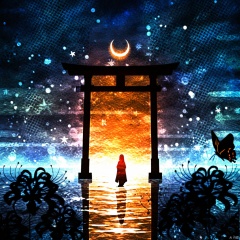 s-style, silhouette painting, ethereal ambiance, 1girl, solo, blue and orange theme, standing, japanese clothes, sky, water, tree, night, moon, bug, scenery, silhouette, torii, crescent moon, star \(sky\), a black silhouette of a person, nature, starry sky, a serene and mystical night scene, a black and orange silhouette of a person standing in front of a large and ornate torii gate which is illuminated from the inside casting a warm and golden glow, the silhouette of the person is dressed in traditional attire which is possibly a kimono, the background is filled with a mesmerizing blend of colors and predominantly blues and purples which representing the night sky., there are numerous stars scattered throughout, and a crescent moon is visible in the center, the water below reflects the colors of the sky, there's a silhouette of a butterfly on the right side, serene, mystical, night scene, torii gate, golden glow, traditional attire, stars, butterfly