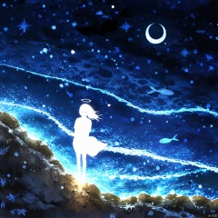 s-style, silhouette painting, ethereal ambiance, 1girl, blue theme, solo, dress, standing, outdoors, sky, white dress, night, glowing, halo, moon, star \(sky\), night sky, scenery, starry sky, silhouette, crescent moon, pillar, long hair, floating, fantasy, a white silhouette of a female figure, a serene nighttime scene, a white silhouette of a girl standing on a rocky terrain who has a halo around her, the sky is filled with stars and a crescent moon in the top right corner and there are fish swimming in the vast expanse of the cosmos. the entire scene is bathed in a deep blue hue, a dreamy and otherworldly ambiance, serene nighttime scene, silhouette of a female figure, halo around her head, stars, rocky terrain, fish swimming, deep blue hue