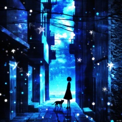 s-style, silhouette painting, ethereal ambiance, 1girl, solo, short hair, dress, standing, outdoors, sky, cloud, star \(symbol\), animal, cat, scenery, fish, blue theme, power lines, utility pole, a black silhouette of a girl, a black silhouette of a cat, wide shot, a serene and dreamlike urban setting at night., a narrow alleyway bordered by old buildings is illuminated by a soft blue glow, the alley is adorned with floating star-like particles, a black silhouette of a girl stand by a black silhouette of a cat, contemplative and ethereal, serene, dreamlike, urban setting, narrow alleyway, old buildings, soft blue glow, star-like particles, girl, dog, silhouette