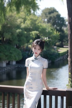 1girl, dress, solo, black hair, chinese clothes, jewelry, earrings, white dress, looking at viewer, china dress, arm behind back, hair bun, day, standing, red lips, tree, short sleeves, outdoors, blurry, bracelet, short hair, architecture, lips, long dress