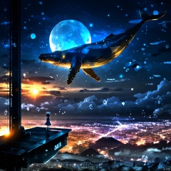 s-style, silhouette painting, ethereal ambiance, sky, blue and orange and dark theme, star \(symbol\), no humans, night, building, star \(sky\), scenery, 1girl, city lights, whale, cloud, moon, night sky, starry sky, fish, bubble, city, cityscape, surreal, a surreal and futuristic nighttime scene, a large metallic platform with a black silhouette of a girl standing on it gazing out at the vast expanse below, the platform is elevated and appears to be connected to a tall and slender tower, a blue and oragnge silhouette of a massive whale floating in the sky which has been transformed into a floating city. this city is adorned with various structures including domes and other architectural marvels, the city below is illuminated with a myriad of lights and suggesting a bustling urban environment, the sky is filled with stars and countless celestial bodies, including a large bright moon, wonder and mystery and awe, platform, tower, domes, architectural marvels, stars, atmosphere