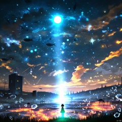 s-style, silhouette painting, ethereal ambiance, 1girl, solo, short hair, blue and orange theme, dress, outdoors, sky, cloud, water, night, glowing, halo, moon, star \(sky\), night sky, scenery, starry sky, city, fantasy, horizon, cityscape, surreal, black hair, standing, building, fish, a thick beam of light shot from the grass into the sky, a radiant blue moon in the sky surrounded by a myriad of stars and nebulae and other cosmic elements, there's a vast expanse of space filled with stars and a few celestial bodies, a mix of rocky terrain and magma, a silhouette of a child with a glowing green aura and glowing legs standing on the ground and surrounded by bubbles which floating in the air, soft ethereal light