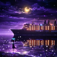 s-style, silhouette painting, ethereal ambiance, 1girl, purple theme, solo, short hair, dress, standing, outdoors, sky, cloud, water, night, halo, moon, star \(sky\), night sky, scenery, starry sky, crescent moon, building, reflection, city, fantasy, city lights, a serene nighttime scene by a body of water., the sky is painted with hues of purple and blue and a crescent moon. the water reflects the colors of the sky and the lights from the ship, a purple and black silhouette of a girl stands by the water's edge on the left gazing at the ship., she wears a dress and has a glowing headpiece, the ship illuminated with lights, a large vessel with multiple decks, the entire scene is bathed in a magical ambiance, sparkles and particles floating in the air, body of water, ship, girl, headpiece, decks, magical ambiance, sparkles, particles