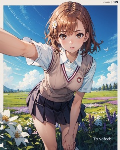 <lora:Misaka-000001:0.8>,Misaka CYQL,1girl,looking at viewer,solo,brown hair,short hair,hair ornament,hairclip,flower,hair flower,brown eyes,school uniform,sweater vest,brown sweater vest,summer uniform,shirt,white shirt,short sleeves,school emblem,skirt,pleated skirt,grey skirt,socks,(sad:1.2),beautiful face,beautiful eyes,glossy skin,shiny skin,(portrait,foreshortening,bent over:1.2),open hand,Meadow flowers, Butterflies, Wildflower carpet, Springtime blooms, English landscape, Meadow breeze,beautiful detailed sky,beautiful detailed glow,(English text:1.3),(border:1.5),posing in front of a colorful and dynamic background,(masterpiece, best quality, beautiful and aesthetic:1.3),contrapposto,female focus,fine fabric emphasis,wallpaper,fashion,Lipstick,depth of field,intricate_detail,finely_detailed,fine_fabric_emphasis,(glossy),<lora:增强减少细节add_detail:0.4>,