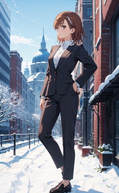 <lora:Misaka-000001:0.8>,Misaka CYQL,1girl,looking at viewer,solo,brown hair,short hair,hair ornament,hairclip,hair flower,brown eyes,(Tailored_blazer:1.4),(Pleated_trousers:1.3),(Pointed-toe_loafers:1.2),(Business_conference_background:1.4),Winter garden, Snow-covered landscape, Frosty blooms, Snowflakes, Winter wonderland, English charm,(kind_smile:1.2),(profile:1.1),foreshortening,beautiful detailed sky,beautiful detailed glow,posing in front of a colorful and dynamic background,masterpiece,best quality,beautiful and aesthetic,contrapposto,female focus,wallpaper,
