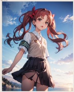 <lora:Kuroko-000003:0.8>,Kuroko CYQL,1girl,looking at viewer,solo,long hair,twintails,brown hair,brown eyes,bow,hair bow,wavy hair,school uniform,sweater vest,summer uniform,armband,skirt,shirt,green armband,pleated skirt,white shirt,v-neck,grey skirt,standing,collared shirt,socks,loafers,(tearing_up:1.2),beautiful face,beautiful eyes,glossy skin,shiny skin,(portrait,from_below,on stomach:1.2),outstretched hand,Amalfi Coast, Dinner, Sunset, Cliffside view, Romance,spider_lily,beautiful detailed sky,beautiful detailed glow,(English text:1.3),(border:1.5),posing in front of a colorful and dynamic background,(masterpiece, best quality, beautiful and aesthetic:1.3),contrapposto,female focus,fine fabric emphasis,wallpaper,fashion,Lipstick,depth of field,intricate_detail,finely_detailed,fine_fabric_emphasis,(glossy),<lora:增强减少细节add_detail:0.4>,