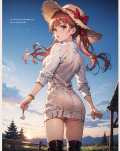 <lora:Kuroko-000003:0.8>,Kuroko CYQL,1girl,looking at viewer,solo,long hair,twintails,brown hair,brown eyes,bow,hair bow,wavy hair,(Knit_sweater_dress:1.5),(Thigh-high_boots:1.4),(Felt_fedora_hat:1.3),(Countryside_background:1.5),(blush:1.2),beautiful face,beautiful eyes,glossy skin,shiny skin,(panorama,from_back,stretching:1.2),crossed arms,Massage table, Yoga mats, Meditation cushions, Essential oil diffuser, Exercise balls,Night-blooming jasmine,beautiful detailed sky,beautiful detailed glow,(English text:1.3),(border:1.5),posing in front of a colorful and dynamic background,(masterpiece, best quality, beautiful and aesthetic:1.3),contrapposto,female focus,fine fabric emphasis,wallpaper,fashion,Lipstick,depth of field,intricate_detail,finely_detailed,fine_fabric_emphasis,(glossy),<lora:增强减少细节add_detail:0.4>,