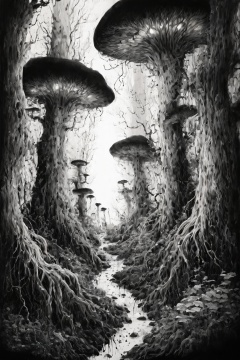 A surreal ink drawing of an enchanted forest, trees with twisting roots and glowing mushrooms, mythical creatures hiding in the shadows, deep contrasts of black ink, mystical lighting, fantasy realism, intricate details, hd quality,ink_style