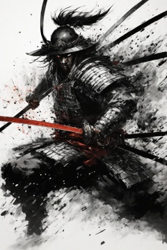 A dynamic ink illustration of a samurai mid-battle, swords clashing with sparks flying, intense movement, traditional armor, detailed linework, blurred motion of the background to emphasize action, Edo-period Japanese art style, hd quality,ink_style