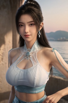 best quality, masterpiece, realistic,cowboy_shot,(Good structure), DSLR Quality,Depth of field,kind smile,looking_at_viewer,Dynamic pose, 1girl, solo, long hair, , looking at viewer, skirt, hair ornament, bare shoulders, jewelry, , earrings, outdoors, midriff, water, necklace, lips, crop top, ocean, white skirt, strapless vest, sunset, sun, ponytail,Xningyao, (big breasts:1.59),
