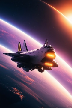 Captured from a high-angle perspective, a space shuttle is soaring through the sky. The shuttle is adorned with glowing yellow lights, adding a pop of color to the otherwise monochromatic scene. The backdrop is a vibrant combination of purple, pink, and orange hues, creating a stunning contrast to the space shuttle. To the right of the shuttle, a large orange planet can be seen, adding depth to the composition.