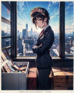 <lora:Uiharu-000007:0.8>,Uiharu CYQL,1girl,looking at viewer,solo,short hair,black hair,brown eyes,head wreath,flower,hair flower,(Structured_blazer:1.4),(Cigarette_pants:1.3),(Pointed-toe_pumps:1.2),(City_skyline_background:1.4),(tearing_up:1.2),beautiful face,beautiful eyes,glossy skin,shiny skin,(cowboy_shot,from_side,hugging own legs:1.2),head tilt,Bunk beds, Toy chest, Play area, Wall decals, Children's books,orchid,beautiful detailed sky,beautiful detailed glow,(English text:1.3),(border:1.5),posing in front of a colorful and dynamic background,(masterpiece, best quality, beautiful and aesthetic:1.3),contrapposto,female focus,fine fabric emphasis,wallpaper,fashion,Lipstick,depth of field,intricate_detail,finely_detailed,fine_fabric_emphasis,(glossy),<lora:增强减少细节add_detail:0.4>,