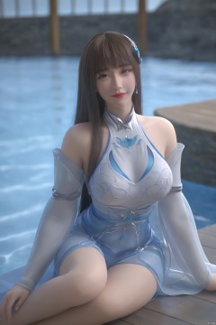 1girl, breasts, water, ocean, sitting, bare_shoulders, jewelry, beach, dress, brown_hair, solo, large_breasts, arm_support, pelvic_curtain, red_lips, looking_at_viewer, long_hair, white_dress, shore, pool, black_hair, collarbone,1 girl,Xningxiaodie
