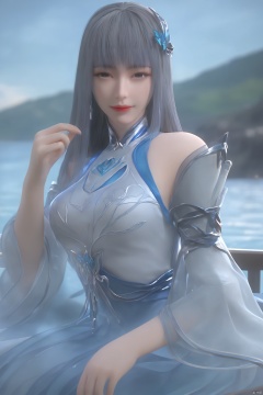 1girl, breasts, water, ocean, sitting, bare_shoulders, jewelry, beach, dress, brown_hair, solo, large_breasts, arm_support, pelvic_curtain, red_lips, looking_at_viewer, long_hair, white_dress, shore, pool, black_hair, collarbone,1 girl,Xningxiaodie
