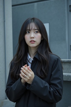 A melancholic Korean 1girl stands against a cold, industrial backdrop, her gaze lost in space. Her pale hands, captured in an emotional gesture, tell an unspoken story. UHD 4k Professional Photograph.
