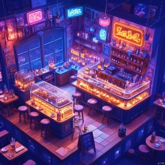 游戏场景,高空视角拍摄,一个酒吧,夜晚,霓虹灯,迷幻的