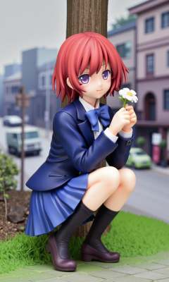 a 3D rendering of a figurine ,nishikino maki, 1girl, solo, looking at viewer, short hair, skirt, long sleeves, holding, bow, jacket, school uniform, purple eyes, flower, outdoors, red hair, pleated skirt, shoes, socks, day, bowtie, blue skirt, tree, blue bow, squatting, blue jacket, black socks, grass, blazer, scenery, motor vehicle, blue bowtie, winter uniform, otonokizaka school uniform, photo background, real world location <lora:MiaoKaPVC_flux:1>