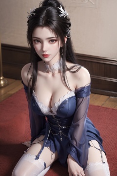 1girl,bare shoulders, black hair, breasts, brown eyes, cleavage, hand on own chest, kneeling, long hair, looking at viewer, off shoulder, solo, thighhighs, white legwear  <lora:李沐婉:0.8>