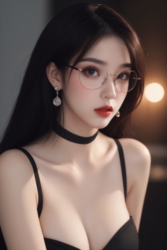 1girl, black choker, black hair, blurry, blurry background, blurry foreground, breasts, choker, cleavage, collarbone, depth of field, earrings, glasses, jewelry, large breasts, lips, long hair, looking at viewer, red lips, solo focus <lora:御姐:1>