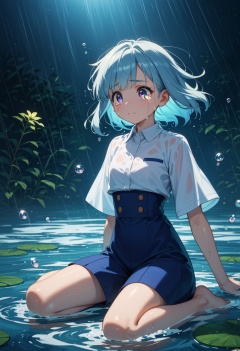 score_9,score_8_up,score_7_up,masterpiece,best quality,8k,dramatic lighting,cold colors,ray tracing,cinematic lighting,shiny_skin,fair_skin,white_skin,1girl,grey_medium_hair,asymmetrical_bangs,cute_face,(thin_waist,thin:1.2),full body,girl sitting on the ground,crying,tears,ambient air weightlessness,(countless drops of water floating in the air:1.3),the ground is full of water,(huge drops of water:1.3),(water drops in the air:1.3),eyes emit bright light,glowing_eye,(fluctuations in air:1.3),(glowing drops of water:1.3),heavy rain,