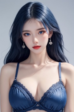 1girl, blue eyes, blue hair, bra, breasts, cleavage, collarbone, earrings, floral print, grey background, jewelry, lace, lace-trimmed bra, lace bra, lace trim, large breasts, long hair, looking at viewer, solo, underwear, upper body ,(blue eyes and blue hair beauty:1.2)  <lora:蓝色:1>