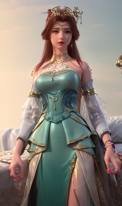 3D,masterpiece,(best quality),(makeup),official art, extremely detailed cg 8k wallpaper,((crystalstexture skin)), (extremely delicate and beautiful),(highly detailed),(face),(headgear),(tassel),(1girl), (solo), (jewelry), (earrings),(brown_hair),(long_hair),(hair_ornament),(handwear),(breasts),(standing),,(detached_sleeves),(bare_shoulders),,((upper_body)),(dress),(multicolored_clothes),(multicolored_dress),(closed_mouth),(traditional_clothes),(long_dress),(long_skirt),(gold_trim),(shorts),(shiny_clothes),(sunshine, outdoor,bed),((looking_at_viewer)),((Facing the camera)), , <lora:hipoly3DModelLora_v10:0.3>