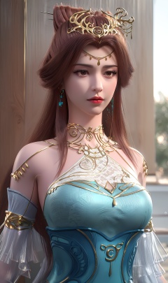 3D,masterpiece,(best quality),(makeup),official art, extremely detailed cg 8k wallpaper,((crystalstexture skin)), (extremely delicate and beautiful),(highly detailed),(face),(headgear),(tassel),(1girl), (solo), (jewelry), (earrings),(brown_hair),(long_hair),(hair_ornament),(handwear),(standing),(bare_shoulders),,((upper_body)),(dress),(multicolored_clothes),(multicolored_dress),(closed_mouth),(traditional_clothes),((gold_trim),shiny_clothes),(sunshine, outdoor),((looking_at_viewer)),((Facing the camera)), , <lora:hipoly3DModelLora_v10:0.3>