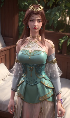 3D,masterpiece,(best quality),(makeup),official art, extremely detailed cg 8k wallpaper,((crystalstexture skin)), (extremely delicate and beautiful),(highly detailed),(face),(headgear),(tassel),(1girl), (solo), (jewelry), (earrings),(brown_hair),(long_hair),(hair_ornament),(handwear),(breasts),(standing),,(detached_sleeves),(bare_shoulders),,((upper_body)),(dress),(multicolored_clothes),(multicolored_dress),(closed_mouth),(traditional_clothes),(long_dress),(long_skirt),(gold_trim),(shorts),(shiny_clothes),(sunshine, outdoor,bed),((looking_at_viewer)),((Facing the camera)), (long_legs),, <lora:hipoly3DModelLora_v10:0.3>