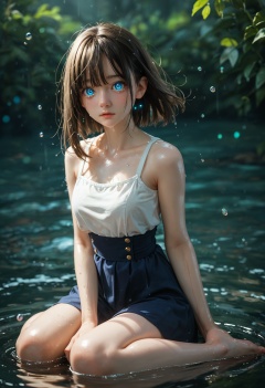 score_9,score_8_up,score_7_up,masterpiece,best quality,8k,dramatic lighting,cold colors,ray tracing,cinematic lighting,shiny_skin,fair_skin,white_skin,1girl,grey_medium_hair,asymmetrical_bangs,cute_face,(thin_waist,thin:1.2),full body,girl sitting on the ground,crying,tears,ambient air weightlessness,(countless drops of water floating in the air:1.3),the ground is full of water,(huge drops of water:1.3),(water drops in the air:1.3),eyes emit bright light,glowing_eye,(fluctuations in air:1.3),(glowing drops of water:1.3),heavy rain,