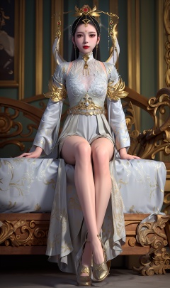 3D,masterpiece,(best quality),(makeup),official art, extremely detailed cg 8k wallpaper,((crystalstexture skin)), (extremely delicate and beautiful),(highly detailed),(face),(collar),(gold_trim),((tiara)),(headdress),feather,(facial_mark),(floating),(floating_object),gem,(princess0),(crown),(headpiece),(headdress),(cape),(horned_headwear),(long_sleeves),(1girl), (solo), (jewelry), (earrings),(black_hair),(long_hair),(hair_ornament),(handwear),(breasts),(sitting),((full_body,whole_body)),(closed_mouth),(long_skirt),(chinese_clothes),(dress),,(multicolored_clothes),(multicolored_dress),(shiny_clothes),(city,indoor,bed),(robe),,((looking_at_viewer)),((Facing the camera)),(shoes), (cloth_shoes),(flat_shoes), , <lora:hipoly3DModelLora_v10:0.3>