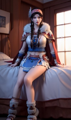 3D,masterpiece,(best quality),(makeup),official art, extremely detailed cg 8k wallpaper,((crystalstexture skin)), (extremely delicate and beautiful),(highly detailed),(face),(twin_braids),(headdress),(feather_hair_ornament),(headband),(facial_mark),(feather_trim),(1girl), (solo), (jewelry), (earrings),(black_hair),(long_hair),(hair_ornament),(handwear),(breasts),(sitting),((full_body,whole_body)),(long_legs),(closed_mouth),(skirt),(chinese_clothes),(dress),,(multicolored_clothes),(multicolored_dress),(shiny_clothes),(city,indoor,bed),(wristband),(navel),(fur),(ribbon),(fur-trimmed_cape),(cloak),,((looking_at_viewer)),((Facing the camera)),(shoes), (blue_footwear),(gold_footwear),(sandals), (anklet),(boots), (toeless_legwear),(toeless_footwear), , <lora:hipoly3DModelLora_v10:0.3>