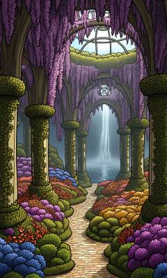 garden of eden, vivid colorful flowers, lots of purple and pink wisteria hanging from ceiling, overgrown, vines, moss, style of Renato Mucillo landscape, Andreas Rocha artstation :: epic scale, dramatic lighting, 8k post processing, many golden layers, trending on artstation, environment highly detailed