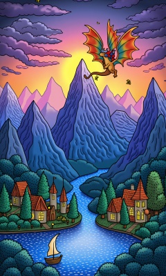 Create a vibrant paper cut style illustration depicting a whimsical fantasy landscape. The scene features towering, layered paper mountains with intricate cutout patterns, their edges softly glowing as if kissed by the light of a setting sun. A majestic, multi-colored dragon with flowing, translucent wings soars gracefully above, its scales made of finely detailed, iridescent paper. In the foreground, a serene, crystal-clear lake mirrors the fantastical sky, with tiny, paper sailboats gently drifting on its surface. Along the lake's edge, a charming village of cozy, paper houses with curved rooftops and glowing windows nestles against the mountains. Ethereal, glowing fireflies, each a delicate paper cut, flutter above lush, vibrant paper trees. The entire scene is bathed in warm, golden light, with soft shadows and subtle gradients adding depth, creating a magical, otherworldly atmosphere. The color palette is rich and harmonious, featuring deep blues, purples, and soft pinks, all with a hint of metallic shimmer to enhance the fantastical elements.